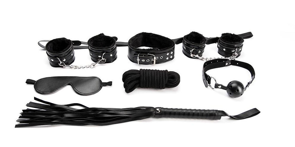 Conjunto de bondage preto de 7 peças, algemas para mãos e tornozelos, máscara, mordaça de bola, flogger, coleira e trela, corda 5m.